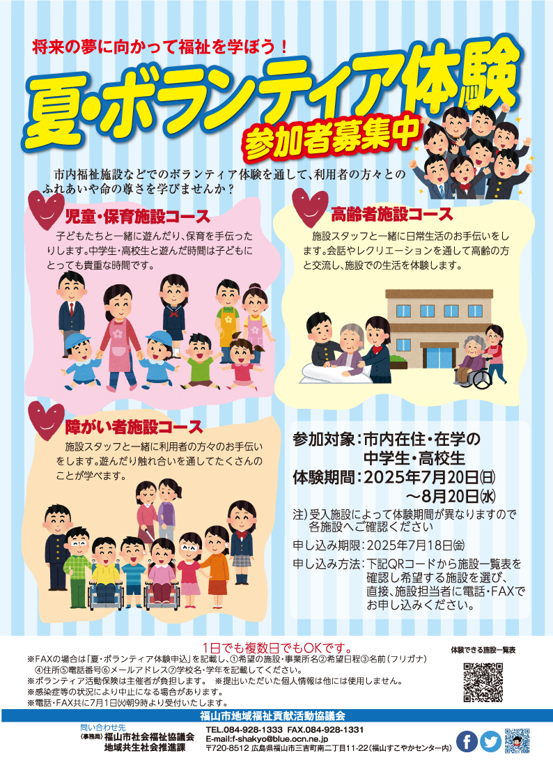 市内福祉施設などでのボランティア体験を通して、利用者の方々とのふれあいや命の尊さを学びませんか?